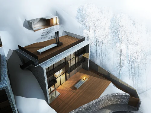 Located at the topmost edge of the development on a cliff like site under a dramatic shear below the Chabrouh monastery, the buildings are fragmented into four identical reinforced concrete shells, inserted into the slope of the mountain, treated as part of the landscape, pivoting slightly to address views and reconcile their relationship to contours. Within these shells, the sections of the vertically staked chalets are manipulated and cranked, offering double height living space, mezzanine like master bedrooms with walls that open up to the double height space in a theatrical motion and unobstructed views from all rooms.