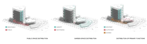 An enclosed garden within the main resort-style lobby, supplemented by personalized gardens and rehabilitative green spaces at every inpatient floor of the bed tower, assures that everyone has access to nature, irrespective of their mobility. The most striking component of the design is the protective enclosure created by the seamless and continuous solar screen, which wraps both the taller inpatient bed tower, as well as the lower rehab gym and pool. Expressing the human instinct to care for our most vulnerable, the sinuous screen follows an undulating pattern, and is designed to parametrically change from facade to facade to compensate for the solar heat gain of its specific location and function. On the inpatient tower, the screen opens up to the multilevel hanging gardens at the corners of each triangular floor plate. This sinuous ribbon, reflecting the commitment to a continuum of care, will leave a lasting impression as a landmark for both the Al-Moosa Hospital brand as well as a gateway to Al-Ahsa.